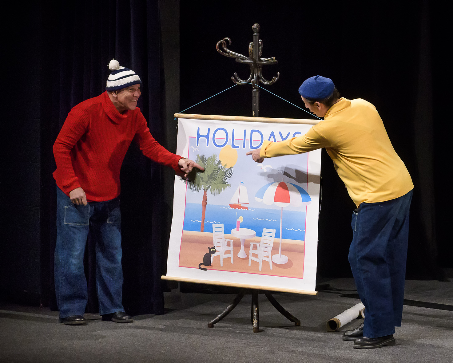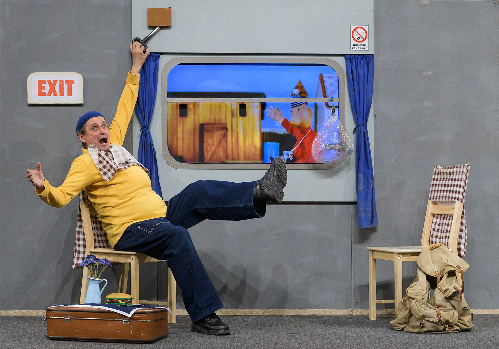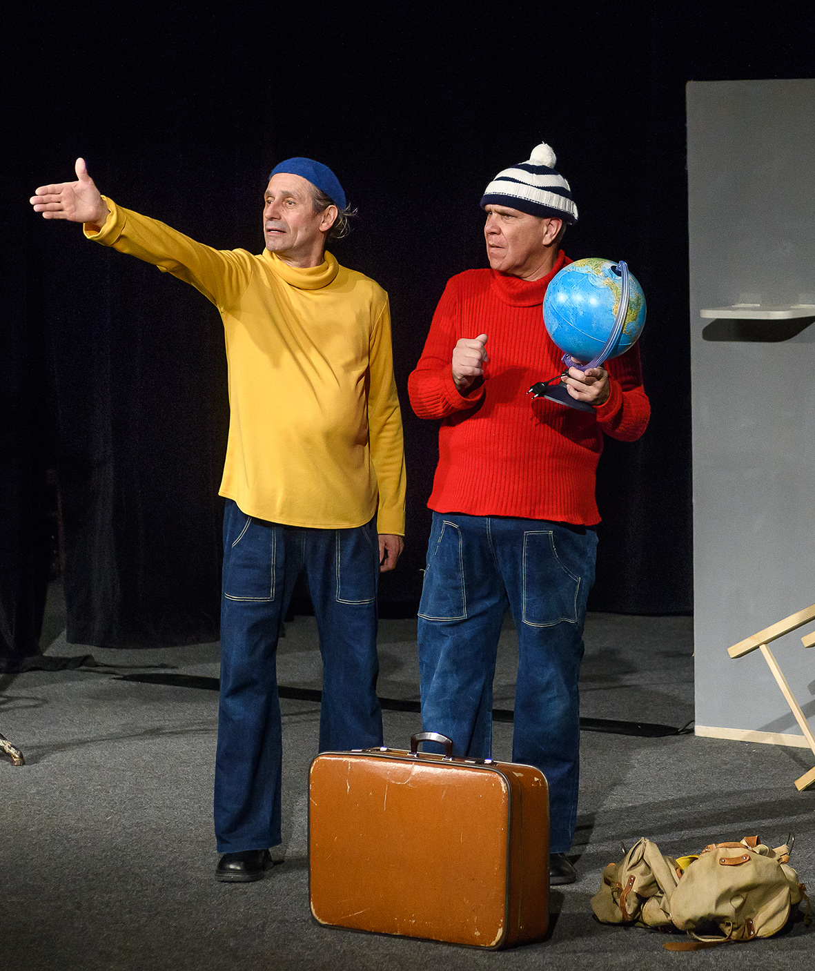 Představení nápaditě spojuje zdánlivě nespojitelné – animovaný loutkový film a hraný projev se živými herci – a vtipně rozvíjí anekdotickou zápletku o tom, jak se dva kutilové vydají na cesty, aby projeli světa kraj, a nakonec beztak zjistili, že doma je to nejlepší. Cestují vlakem, letí letadlem, zamíří do vesmíru, jedou lodí, ocitnou se na mořském dně, kde bojují s děsivým chapadlem, ale když se konečně dostanou do vysněného hotelového pokoje v přímořském letovisku, je jejich jediným zájmem přetvořit neosobní hotelový pokoj tak, aby se co nejvíc podobal jejich domovu.